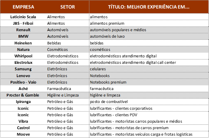 Premiamos as indústrias de alimentos, automóveis, bebidas, cosméticos, eletrônicos, eletrodomésticos, farmacêuticos, higiene e limpeza e petróleo e gás, que proporcionam as melhores experiências do mercado aos seus clientes, com base no exclusivo estudo “Radiografia da experiência do cliente com bens de consumo no Brasil” que combina pesquisa e cliente oculto, que ouviu mais de 4000 consumidores e realizou auditorias dos canais de atendimento por cliente oculto em mais de 100 indústrias. Um estudo único sobre a indústria brasileira, a mais importante do setor no país